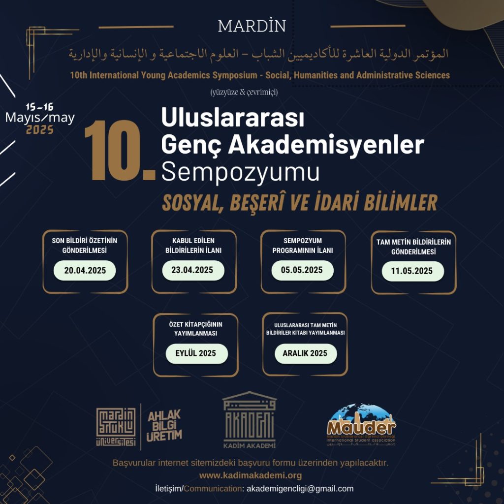 Kadim Düşünce ve Akademik Araştırmalar Derneği olarak, genç akademisyenleri bilimsel araştırma ve bilgi paylaşımı konusunda desteklemek amacıyla düzenlediğimiz 10. Uluslararası Genç Akademisyenler Sempozyumu, 15/16 Mayıs 2025 tarihlerinde Mardin Artuklu Üniversitesi’nde çevrimiçi ve yüz yüze katılım seçenekleriyle gerçekleştirilecektir. Farklı akademik disiplinlerden genç araştırmacıların özgün çalışmalarını sunmalarına, bilimsel tartışmalarla bilgi birikimlerini artırmalarına ve uluslararası akademik ağlarını genişletmelerine olanak tanıyan bu etkinlikte, sizleri de aramızda görmekten onur duyarız. Sempozyumun, uluslararası bilim camiasından birçok değerli katılımcının bir araya gelmesine ve akademik işbirliklerinin güçlenmesine katkı sağlayacağına inanıyoruz.